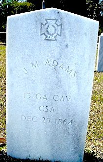It’s for James M. Adams and is located in Laurel Grove Cemetery in Savannah, GA, where he died of acute dysentery on Christmas Day 1864 while a prisoner of war. James was a Corporal in Company G, 13th Georgia Infantry (not Cavalry) at the time of his death.