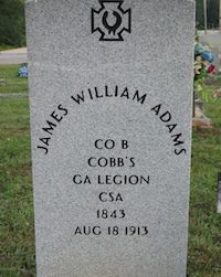 The grave is that of Private William Adams of Company B, Cobbs Legion Infantry Battalion. Adams was wounded at Crampton’s Gap, MD in 1862 and again at Gettysburg in 1863, but survived the war.