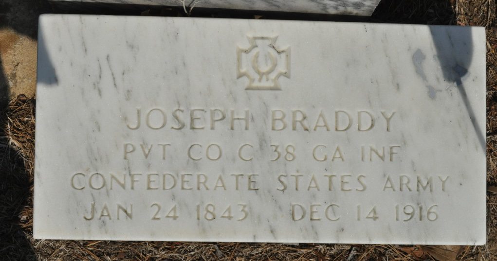 Here’s a whopper in the Hines Baptist Church Cemetery in Summertown, GA. It’s for Joseph Braddy who was a 19 year old farmer when he enlisted in Company A of the 48th Georgia Infantry in March 1862. He was wounded at Sharpsburg but survived to end his war at Appomattox Court House in April 1865. This relatively recent marker has his name and dates right, but confuses his military service with an entirely different man. That man was James Robert Brady (also seen as Joseph Braddy in his service records) [gravesite] who was about 34 years old when he enlisted in Company C of the 38th Georgia Infantry. He died in Virginia in November 1862.