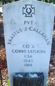 Here’s the recent government marker in Putnam County, GA for Erastus J Calliham, who was a Private in Company A of Cobb’s Legion (Infantry) and was captured at Crampton’s Gap on South Mountain in September 1862. His compiled service records have him as Erastus J Callahan – which is apparently where this stone gets its information.