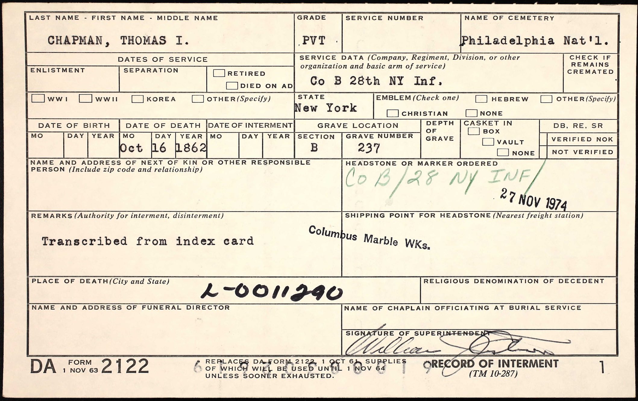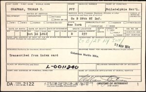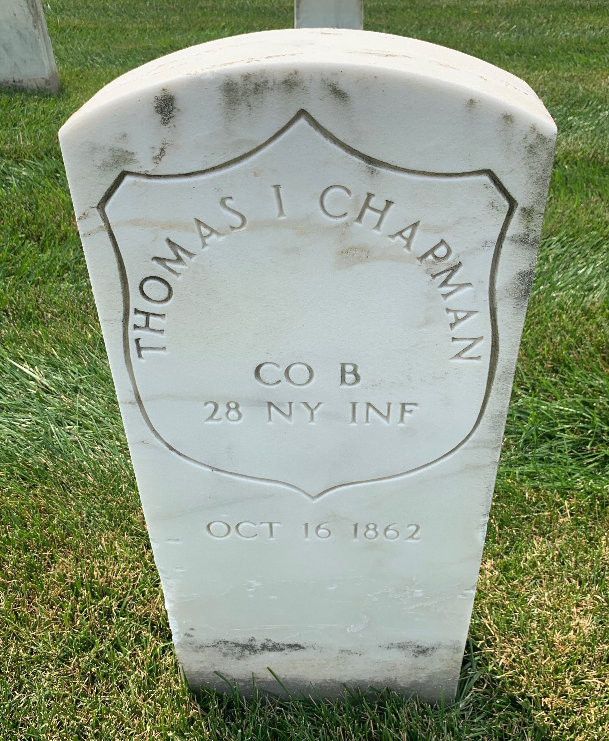 This stone in Philadelphia National Cemetery has several problems, all due to a faulty 1974 application, which can probably be blamed on transcription of earlier cemetery records. The man under it is Private Thomas J Chapman, Company D, 28th New York Infantry, who was mortally wounded in the head at Antietam and died in Philadelphia on 4 October 1862.