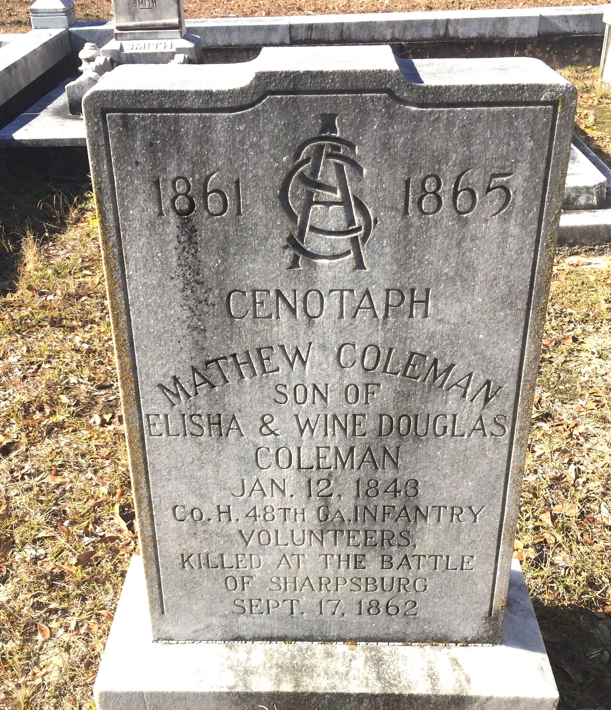 He’s Sgt. Matthew Coleman of Swainsboro, GA and he was only actually in the 38th Infantry, Company C, never the 48th. Other Colemans, including his brother John, also at Sharpsburg, were members of Company H of the 48th, and both units recruited in and around Swainsboro, so it can be confusing. Also, his first name had two Ts and his mother’s name was probably Lavina Wine Douglas.