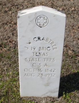This marker is for John William Crabtree, late of Company I, 4th Texas Infantry. He was with them from July 1861 to April 1865, so it’s not clear when he would have served with in the “19th Brigade, Texas State Troops.” That “brigade” was the military district for home guard Militia units in Navarro, Ellis, Freestone, and Limestone counties and didn’t really start mustering troops until July 1861. Even if he was with them, it’s a shame who ever ordered this stone missed his 4 years in Hood’s Brigade. And I think they got his death year wrong to boot. His pension records say he died on 23 August 1931.