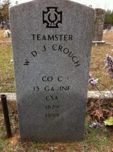 Here’s the modern government marker for Private William D. J. Crouch of Company B, 13th Georgia Infantry in Webster Parish, Louisiana. Crouch was wounded and disabled at Sharpsburg in 1862 and afterward detailed as a teamster into 1864. This stone got his Company wrong and missed out on his rank and first name, so not too bad.
