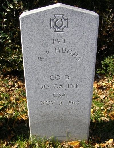 Also at Mt Olivet is this one for Private Richard P Hughes of Lowndes County, GA, who was mortally wounded at Fox’s Gap on 14 September and died in a US hospital in Frederick on 25 November (not 5 November) 1862. His original stone got his death date right, but called him R.H. Hughes.
