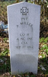 Another Mt. Olivet stone with a small thing wrong follows: this one for Private Alfred M. Miller, Company K (not H) of the 4th North Carolina Infantry. Miller was mortally wounded and captured on South Mountain on 14 September 1862, in a US hospital in Frederick on the 17th, and died of wounds on 23 September 1862. The name on his original/older stone looks like Alfred. D. Miller, so I wonder why his modern stone doesn’t have his first name also.