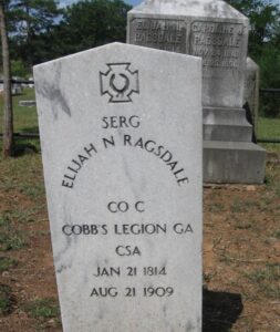 This next one is another case of mistaken identity carved in (government furnished) stone. Sergeant Elijah Marion Ragsdale was 4th Sergeant of Company C, Cobb’s Legion Infantry Battalion when he was mortally wounded in the thigh at Crampton’s Gap on South Mountain on 14 September. He died of that wound complicated by smallpox in Richmond, VA on 21 January 1863.
