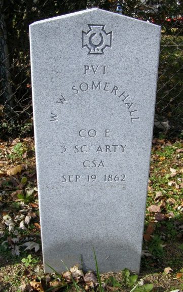Here’s the modern stone in Mt Olivet Cemetery in Frederick for Sergeant William W. Sumerel of Company E, 3rd (James’) South Carolina Infantry Battalion who was mortally wounded on South Mountain on 14 September 1862 and died in a Frederick hospital on the 19th. His hospital records are probably the source of everything wrong on his government stone: his rank, surname, and military unit.