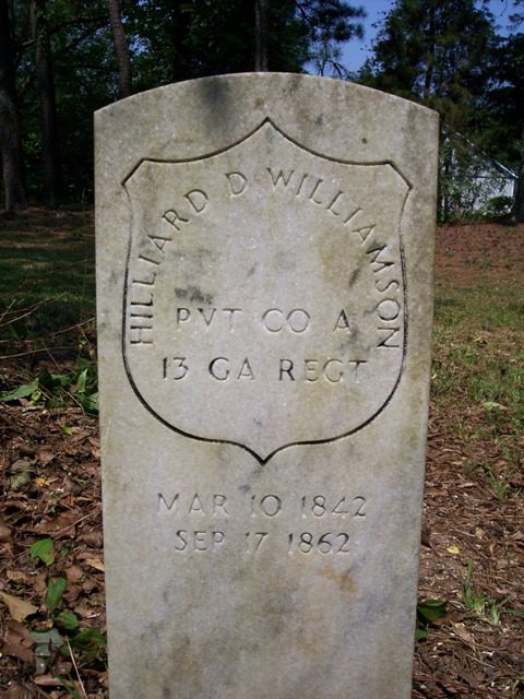 In this next case, I don’t think there’s anything wrong with the information on the stone – just its design: it’s the standard style for US (not Confederate) Civil War and Spanish War veterans – with the rounded top and engraved shield. It’s for Private Hilliard D Williamson of the 13th Georgia Infantry, killed at Sharpsburg.
