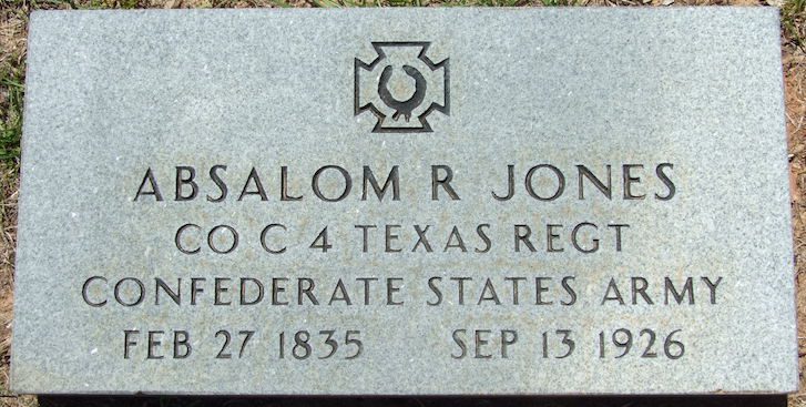 Here’s the government marker in Morgan County, GA for Private Absalom R. Jones. One minor error: he was in Company F, not C, of the 4th Texas (1861-64). Perhaps the person who ordered the stone was confused by his service in Company C of the 4th US Volunteers (1864-66), not mentioned on the marker.