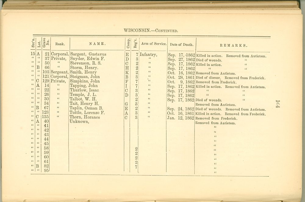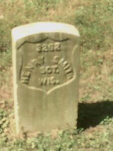 The Cemetery History says he’s Sgt. Henry Smith of Company K, 2nd Wisconsin Infantry, and “Wis.” is written on the headstone. There are no certainties in these matters, but I’m fairly sure that’s wrong.