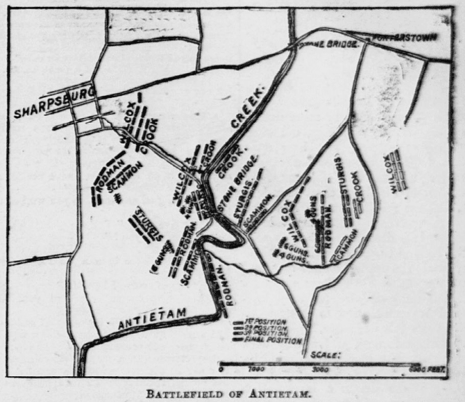 The battle was on the Federal side by detail, rather than by the combined force of the army. In fact, at no time was an entire corps of the great Army of the Potomac thrown against the enemy. The Fifth Corps, fully 12,000 strong, was held in reserve behind Antietam Creek, a little to the left of center; Burnside’s Ninth Corps on the extreme left holding the approach to the bridge since named for him.
