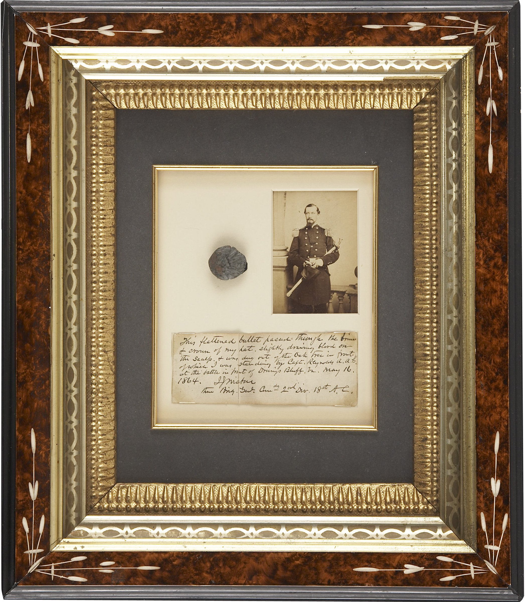 From the seller: A mushroomed Confederate minié ball is preserved in a inlaid period frame with a CDV of the general and a 5″ x 2″ Autograph Note Signed, reading as follows: