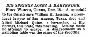 FORT WORTH, Texas, Dec. 18 — A special to the Gazette says William H. Lessing, a prominent lawyer of San Angelo, Texas, shot and killed Michael Quinn, a bartender, at Big Springs, this State, this morning. Lessing made no attempt to escape. A disagreement at a gambling table was the cause of the shooting. [in the New York Times of 19 December 1888]