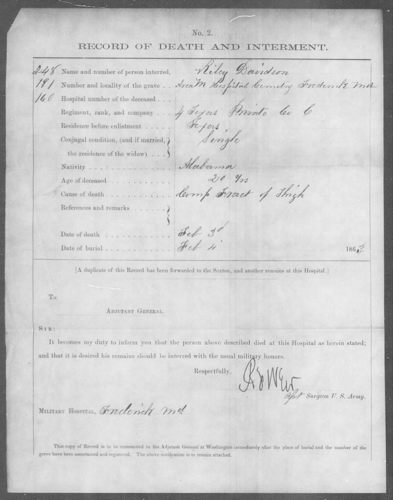 Private Riley Davison of the 4th Texas Infantry was mortally wounded in combat at Sharpsburg on 17 September 1862. He died in US Army General Hospital #1 in Frederick, MD on 3 February 1863 and his burial was recorded by US Army Assistant Surgeon Robert F. Weir (1838-1927), surgeon-in-charge.