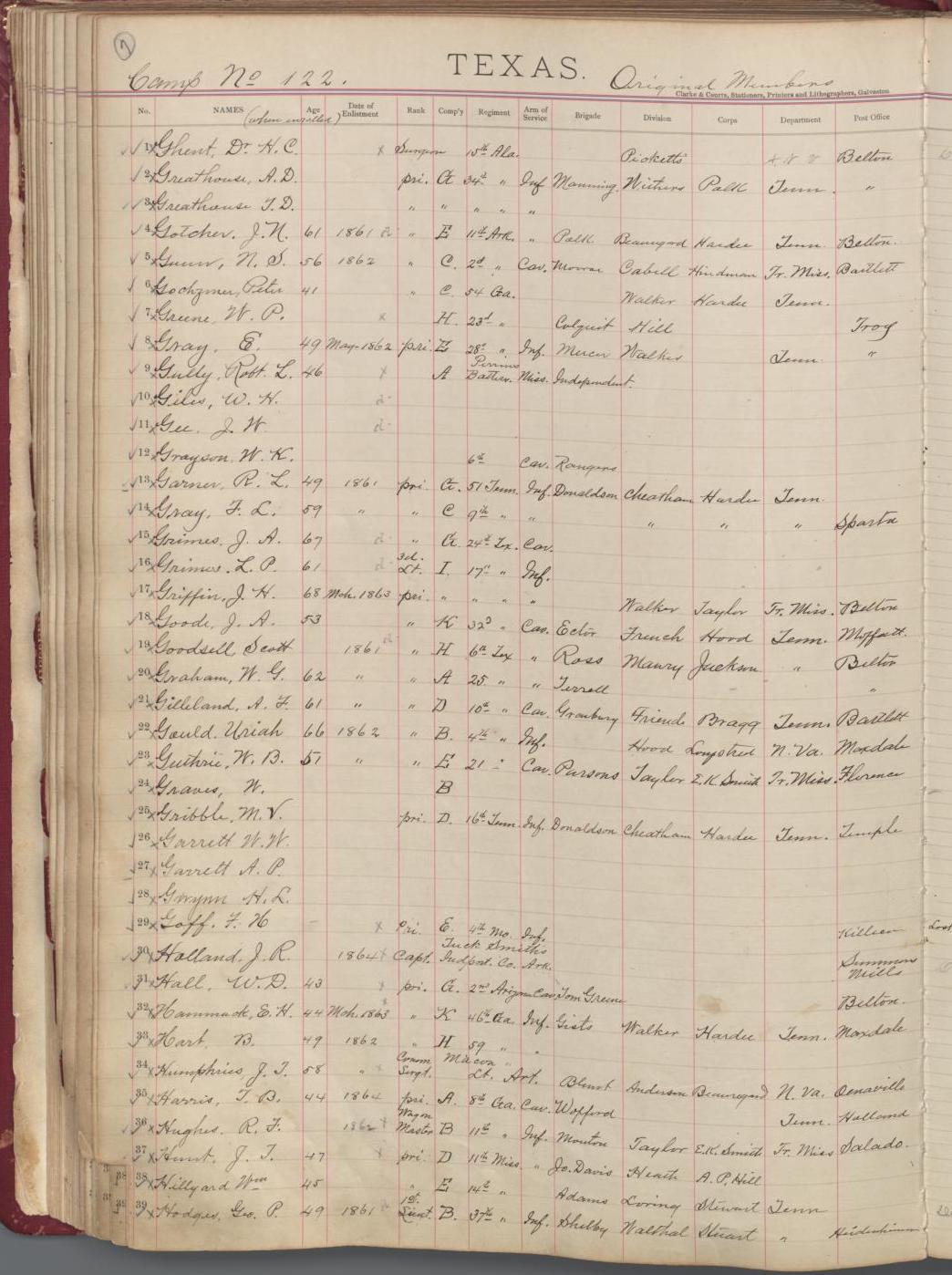 Here’s a page from the ledger of the Bell County [Texas] Ex-Confederate Association which was organized in 1888. An original member was Uriah Gould, late Corporal in Company B, 4th Texas Infantry. Born in New York State, he was an early Wisconsin pioneer, Mexican War veteran, Sharpsburg survivor, and with wife Ann Elizabeth the father of 20 children in 21 years.