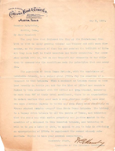 He wrote this letter to Texas State Senator Robert Emmet Cofer (1870-1944) looking for an appropriation of state money to match that already raised privately in an effort to get the project finished. There’s some stirring stuff here: