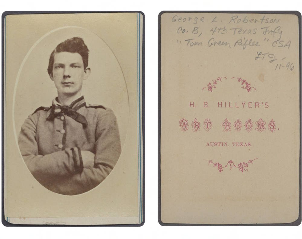 An excellent and expressive photograph from the Lawrence T. Jones III Texas photography collection at Southern Methodist University in Dallas. He’s George L. Robertson of Austin, TX, formerly of Company B, 4th Texas Infantry. His father was prominent in Austin before the war as was George in the decades after.