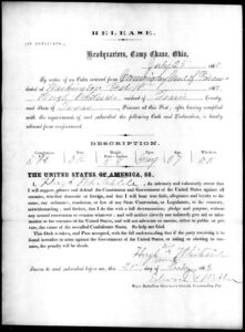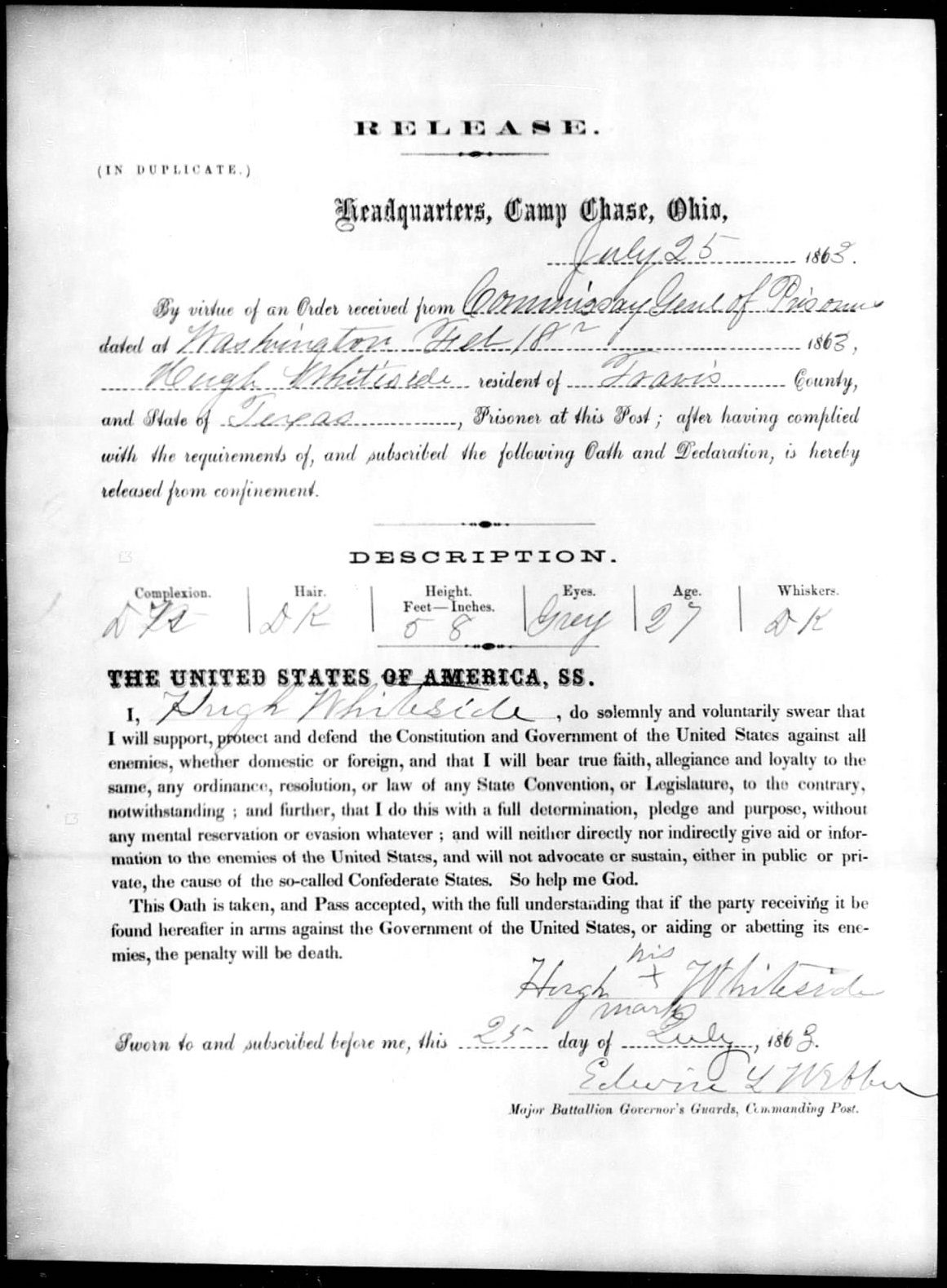 Private Hugh Whitesides of the 4th Texas Infantry “gave himself up” to US troops at Cherry Run, VA (WV) on 19 July 1863 and was sent to Camp Chase, OH, where he swore the oath seen here, made his mark, and was released.