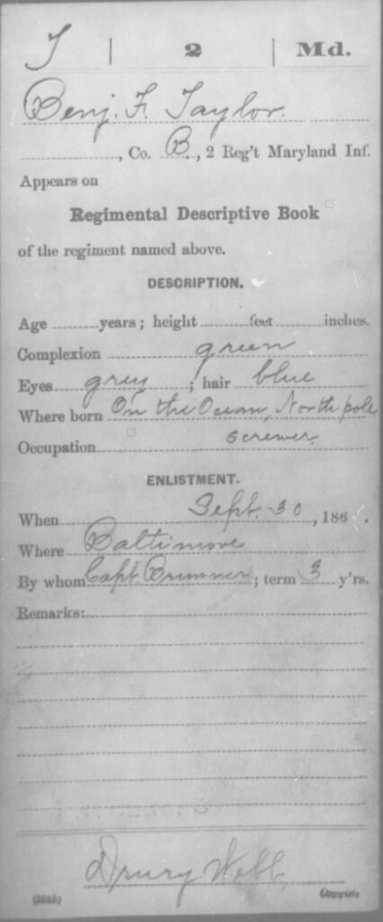 CMSRs: NARA Record Group 94: Records of the Adjutant General’s Office, Carded Records Showing Military Service of Soldiers Who Fought in Volunteer Organizations During the American Civil War, 1890–1912 (“Civil War CMSRs”), [Maryland] Taylor, Benjamin F – Age 23, Year: 1863 – Second Infantry, Af-Wi (NAID: 39425927) [finding aid]