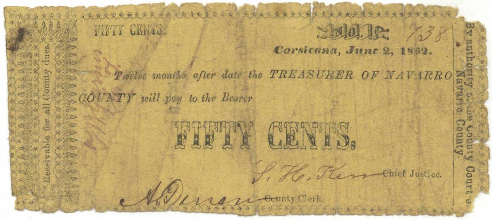 The county treasury bond is online from the Libraries of Southern Methodist University, Dallas, and is part of the Rowe-Barr Collection of Texas Currency. Other examples are available from Navarro County TexGenWeb contributors.