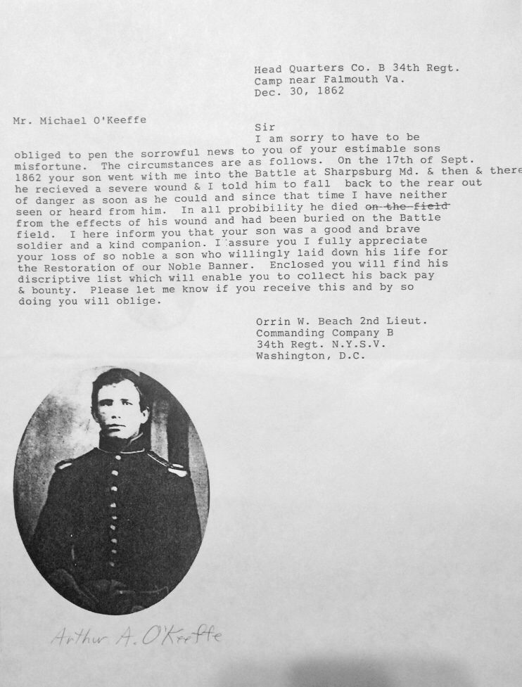 One of the men who fell near him was Corporal Arthur A O’Keefe of Company B. About 3 months later, a newly commissioned 2nd Lieutenant, Beach wrote Corporal O’Keefe’s father about his son’s death at Antietam. Here’s a typescript of that letter accompanied by a copy of a photo of young Arthur.