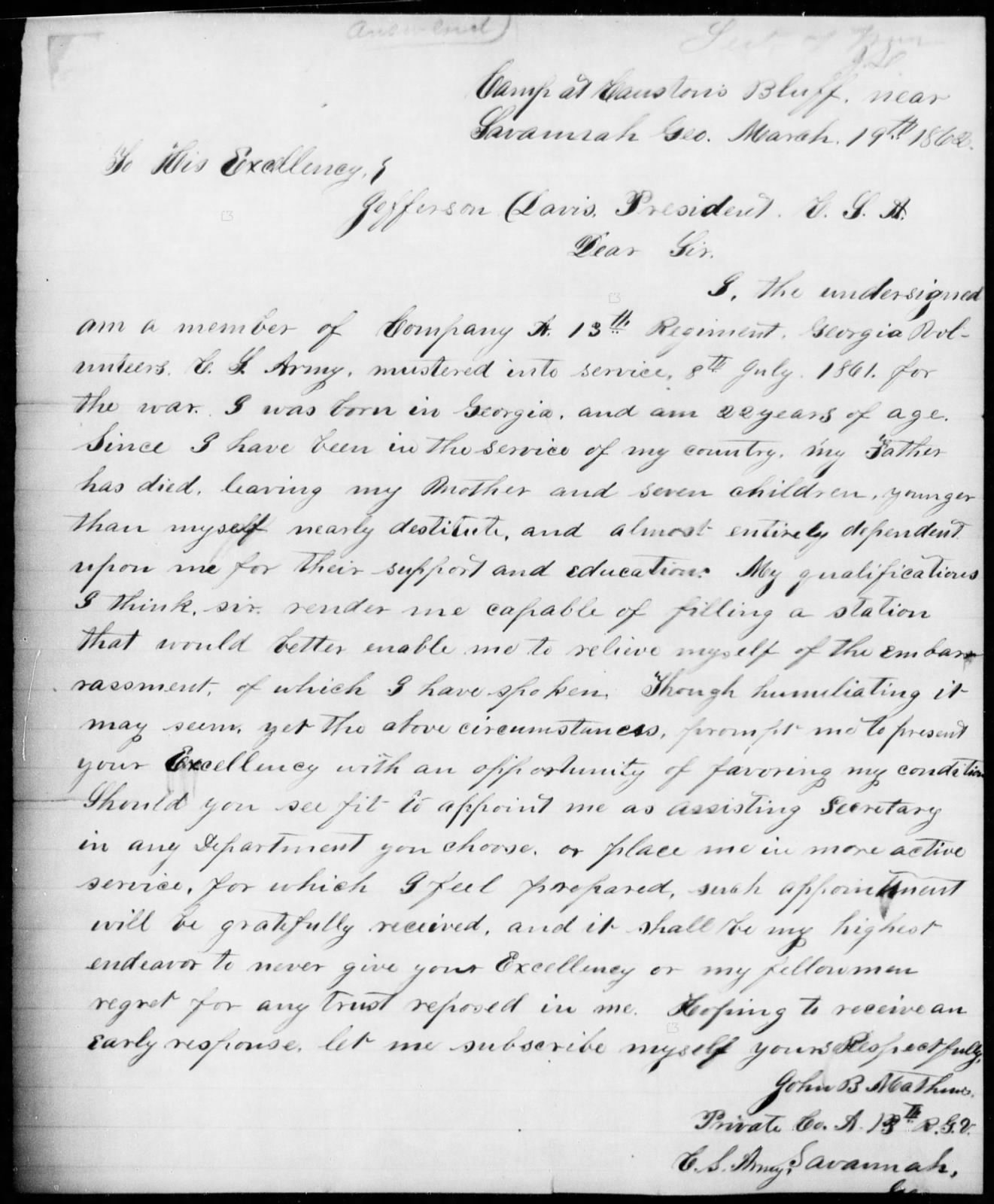Pvt J.B. Mathews to President Jefferson Davis (1862)