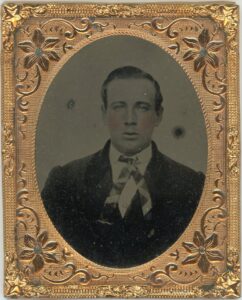 This is Marcus Morton Parmenter, who enlisted as a Private in the First Company, Massachusetts Sharpshooters in March 1862. He was killed – possibly by “friendly fire” – at Antietam on 17 September 1862.