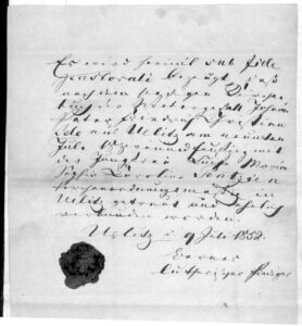 This is a certificate of her marriage on 9 July 1852 in the village of Uelitz in Mecklenburg, Germany.