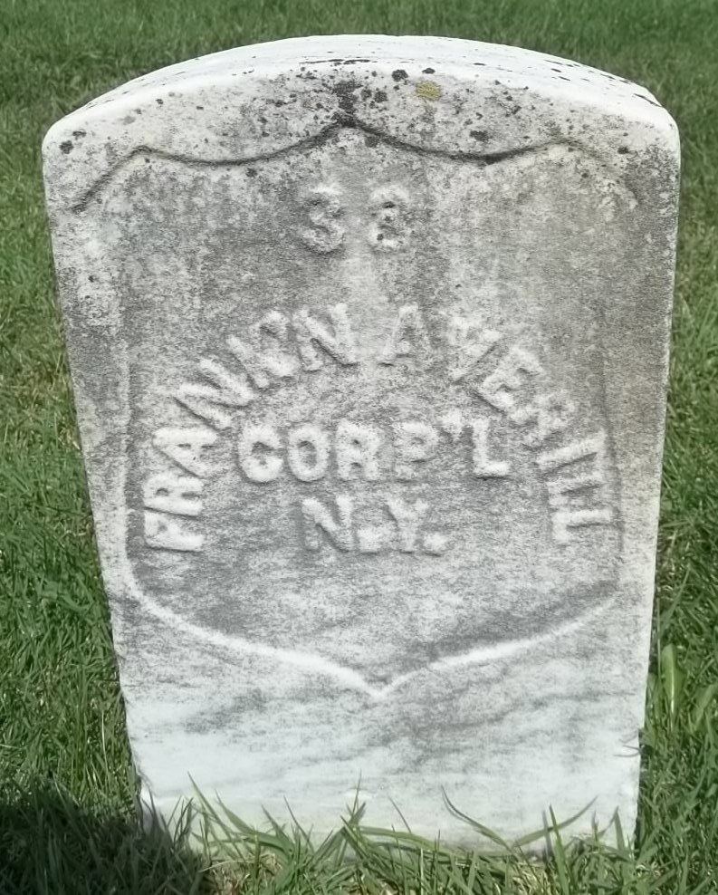 Here’s the gravestone in Antietam National Cemetery for Corporal Franklin Averill of Company H, 21st New York Cavalry. The photograph was shared on his Findagrave memorial by prolific contributor Birdman.