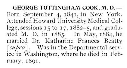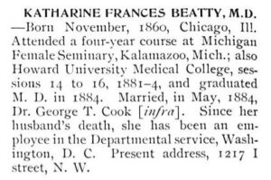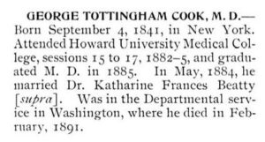 After a stint in business in his native Buffalo, he got a Government job in Washington, DC in 1881, and from 1882-85 went to medical school in the evenings at Howard University. He probably met his wife Kate there – she graduated from Howard with an MD in 1884, he in 1885 – she almost 20 years his junior.