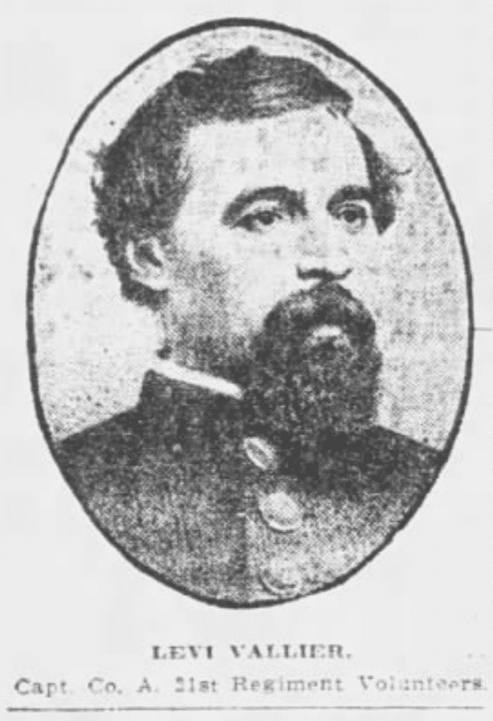 From a 50th anniversary tribute in the Buffalo Times of May 1911 to the First Company, Buffalo (NY) Volunteers – later Company A, 21st New York Infantry – comes the face of Levi Vallier. He was their First Lieutenant when he was wounded at Antietam in September 1862 and mustered out as Captain of the Company in May 1863.