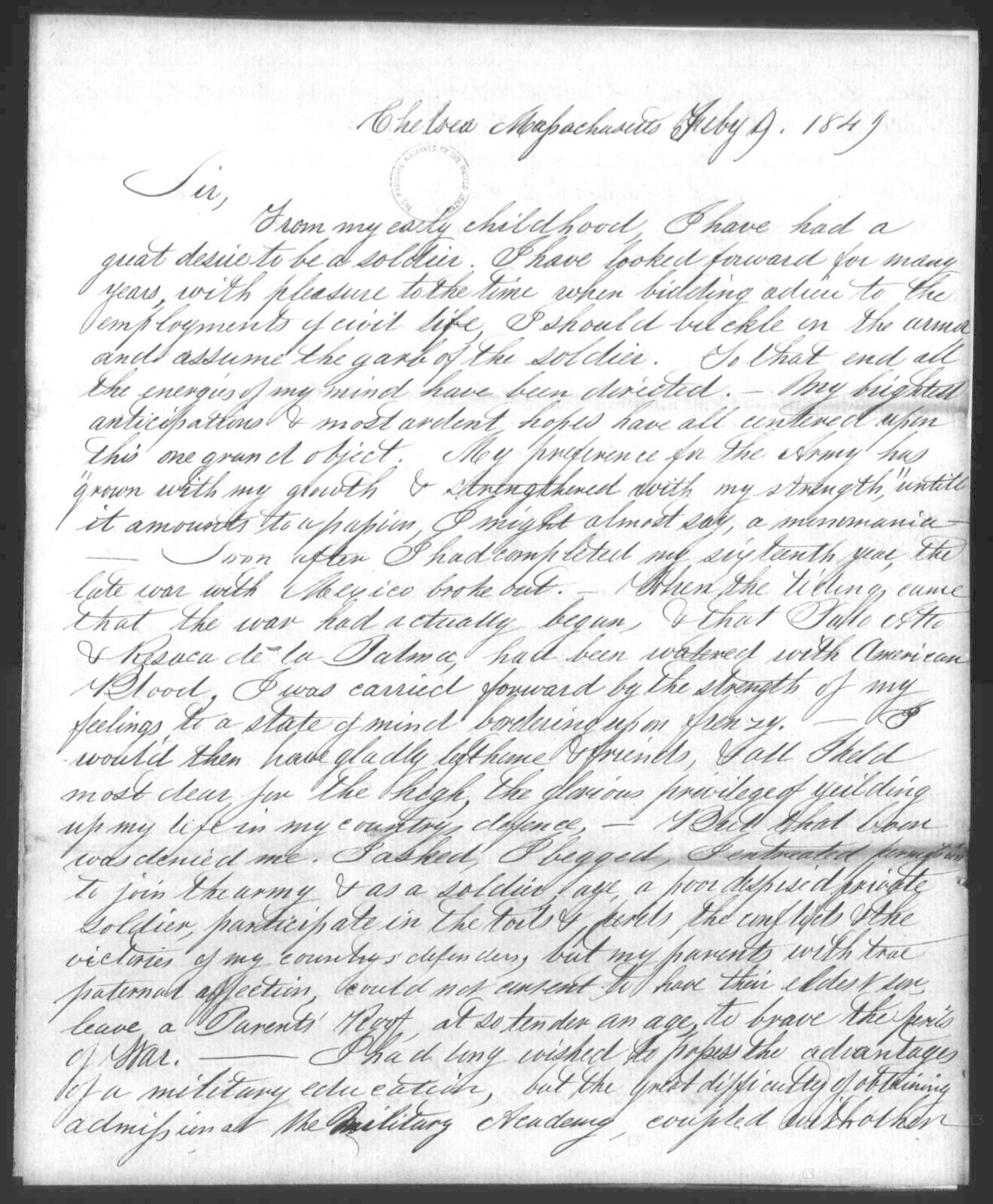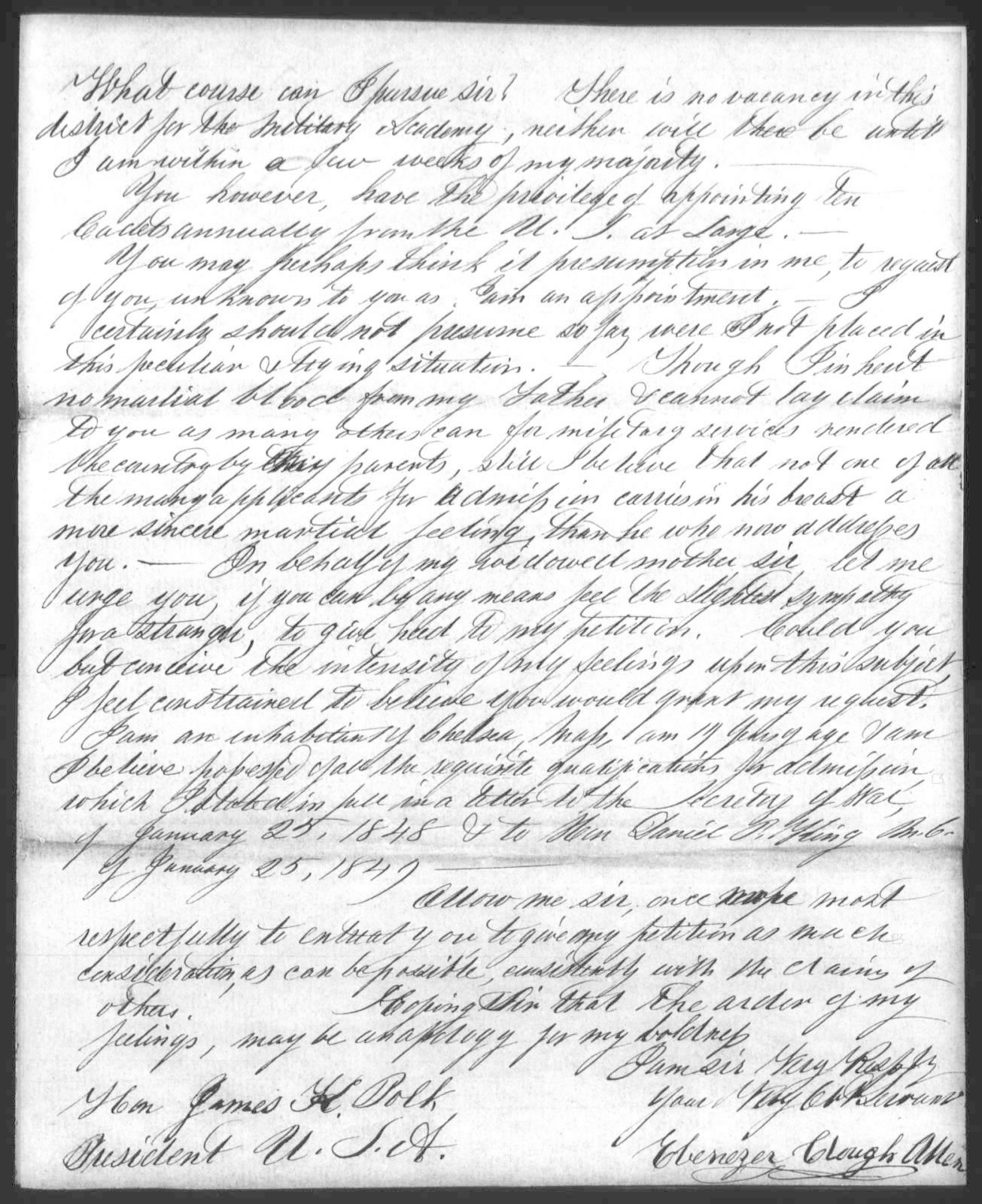 Young Ebenezer Clough Allen was desperate to become a professional soldier but his parents wouldn’t let him enlist for war with Mexico in 1847. He applied to the Secretary of War in January 1848 for a spot at West Point, but was not appointed. In November 1848 he wrote President James K Polk for help. Still no luck. Persistent, he wrote the President again in February 1849 – an emotional and sincere 3 page missive asking for a direct appointment to the Academy.
