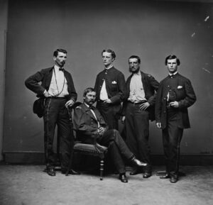 left to right: Bvt. Lt. Col. Myles Keogh, Maj. Gen. John Buford, Capt. Peter Penn Gaskell, Capt. C.W. [Craig Wharton] Wadsworth, Lt. Col. A.P. [Albert Payson] Morrow.