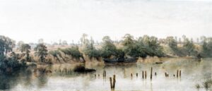 The painting is by John R. Key. The original caption: “School ship of Confederate Naval Academy at Drewry’s Bluff, circa 1863. On right is a tug and an ironclad of the James River Squadron.”