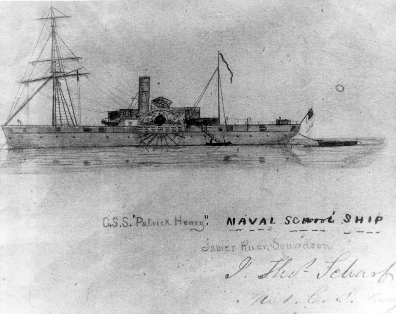 The drawing of the Patrick Henry was done by Midshipman and Pinckney’s classmate John Thomas Scharf, later author of History of the Confederate States Navy from its organization to the surrender of its last vessel … (1894) [online from the Hathi Trust]. That volume includes a chapter of detail on the CS Naval Academy. His drawing is online from the US Navy, Naval History and Heritage Command.
