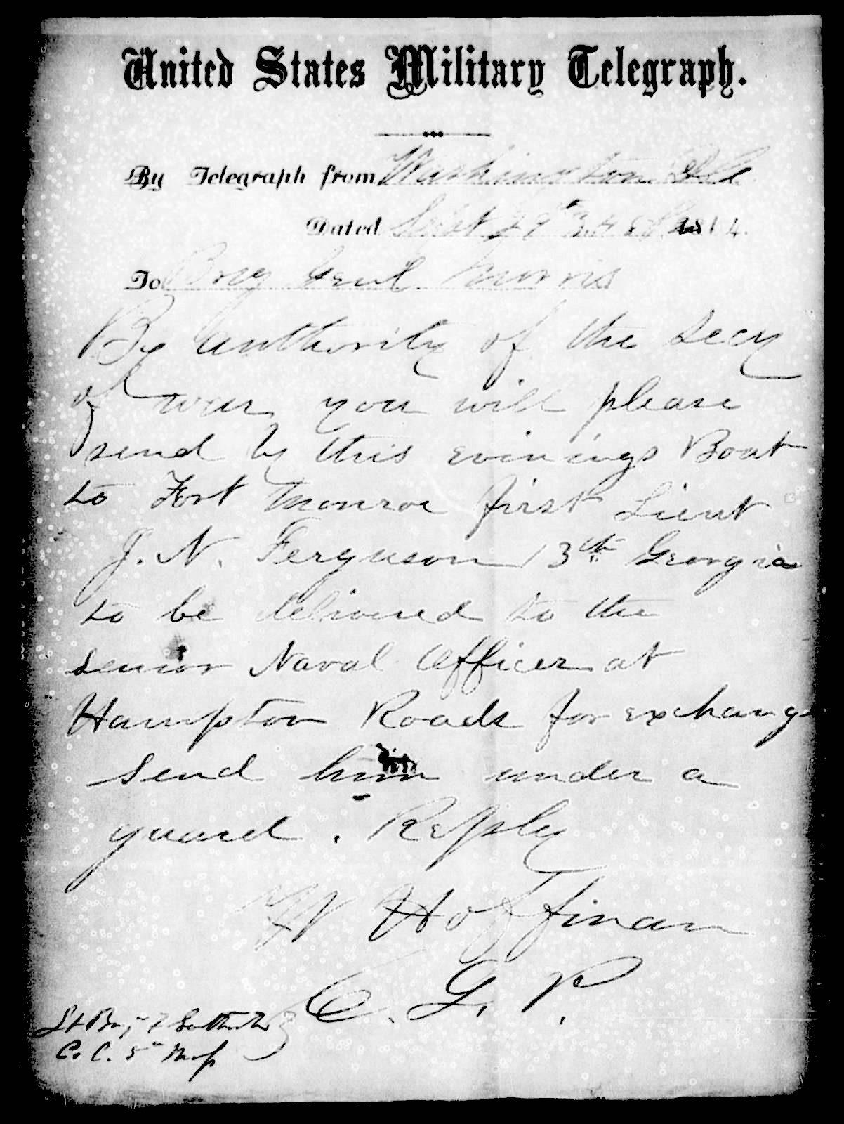 To Brig Genl BarnesBy authority of the Secy of War you will please send by this evenings Boat to Fort Monroe First Lieut J. N. Ferguson 13th Georgia to be delivered to the senior Naval Officer at Hampton Roads for exchange.