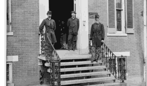 Here’s a lovely c. 1865 photograph of him (standing on steps at right) at that headquarters office from the Library of Congress.