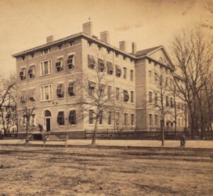 That photo of the War Department Building in Washington, DC in about 1870 was shared from his collection by John DeFerrari in The Eisenhower Executive Office Building, America’s “Greatest Monstrosity”. His subject is the building which replaced the old War, Navy, and State buildings between 1871 and 1888.