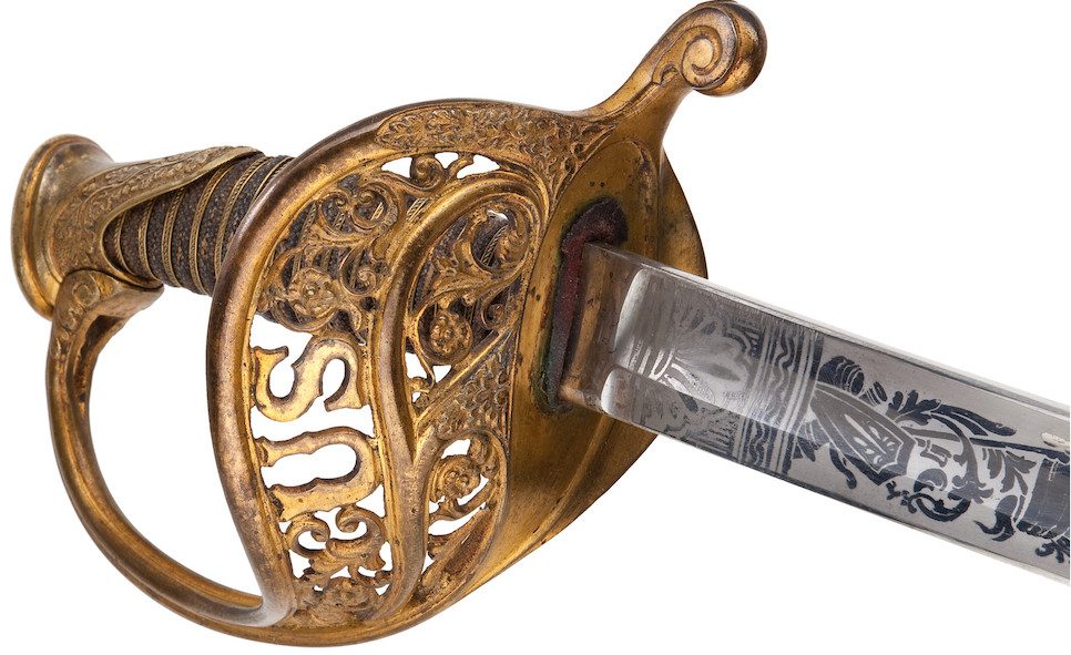This stunning object is the hilt of a highly decorated United States Model of 1850 Foot Officer’s Sword presented by the men of his battery to Captain John Davis Frank in February 1862.