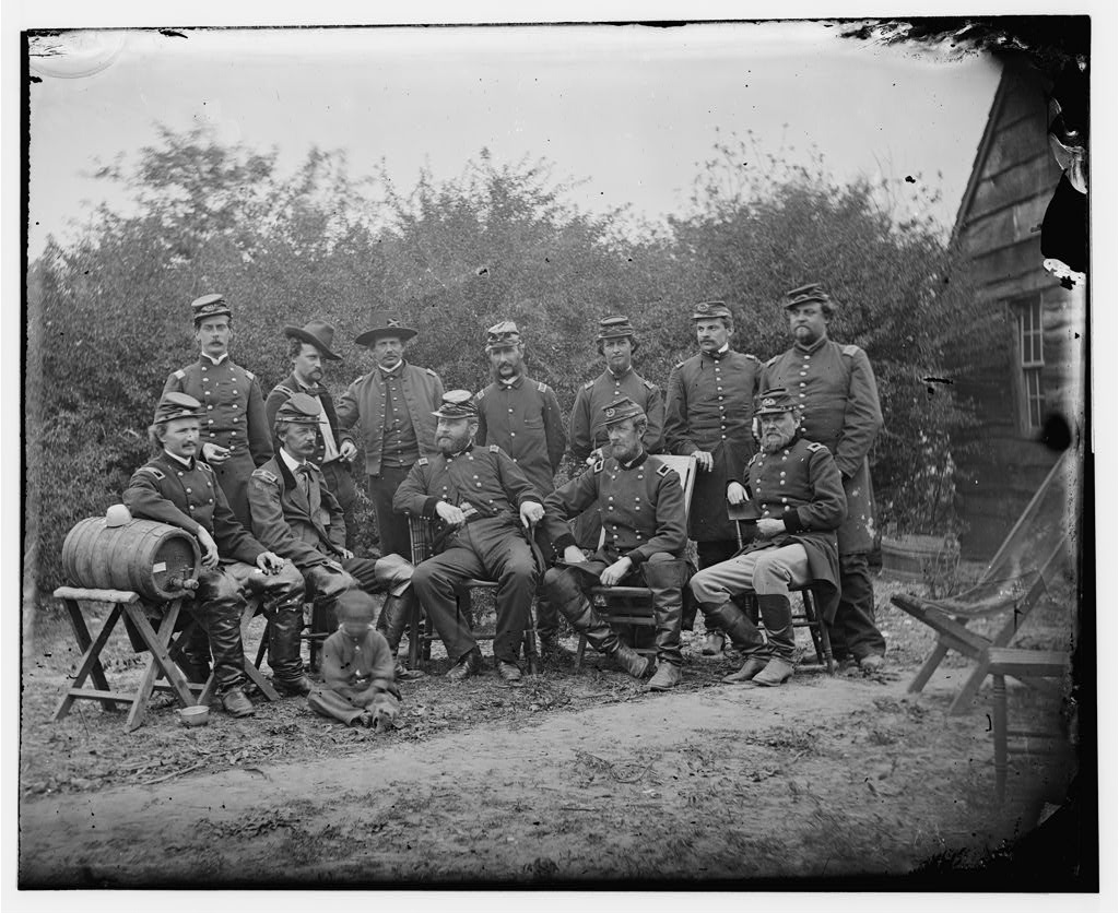 Seated: Col. Joseph J. Bartlett (formerly identified as Andrew A. Humphreys), Henry Slocum, Wm. B. Franklin, Wm. F. Barry and John Newton. Officers standing not indentified. African American child seated in front.