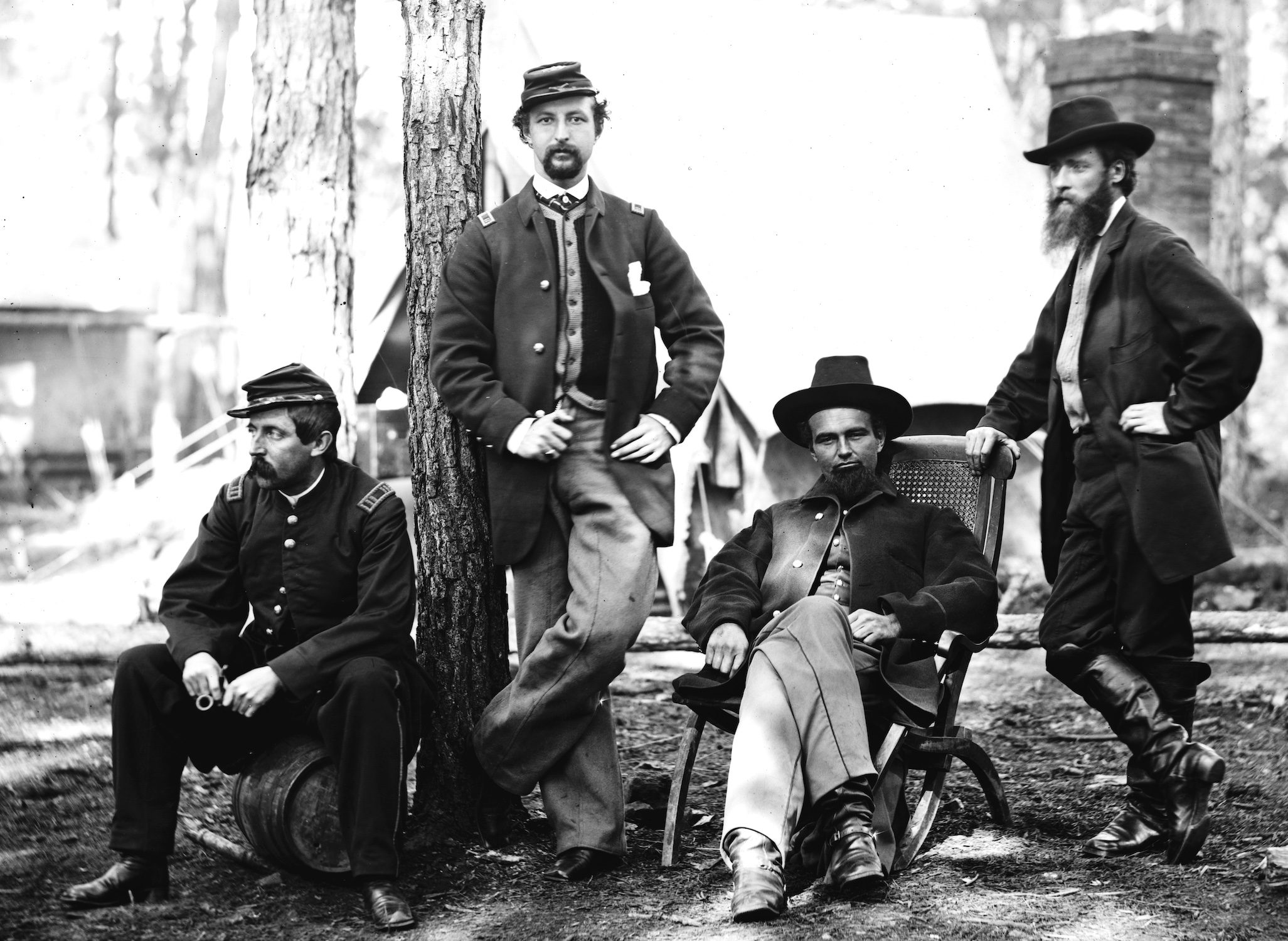 James Gardner took this photograph at Brandy Station, VA in December 1863. The men in it are identified (left to right) as: