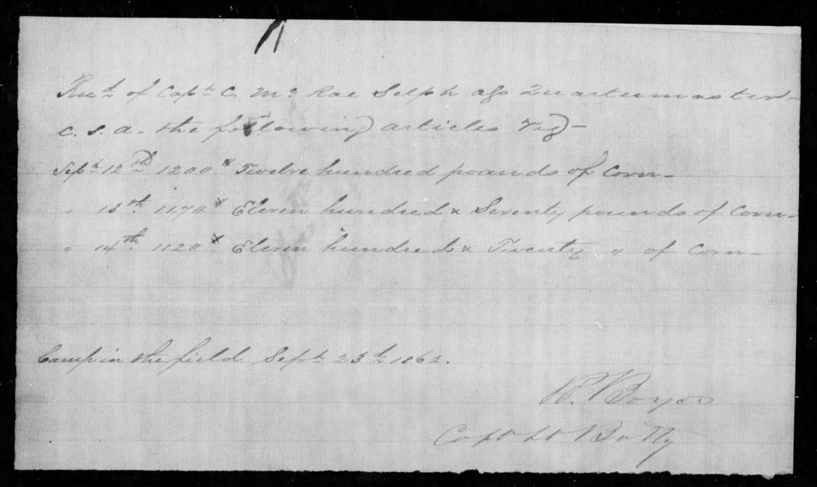 While going through documents in Captain Robert Boyce‘s Consolidated Service Record (CSR) jacket, I came upon this receipt dated “Camp in the field Sept 23d 1862.”