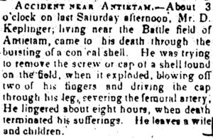 About 3 o’clock on last Saturday afternoon, Mr. D Keplinger, living near the Battle field of Antietam, came to his death through the bursting of a conical shell. He was trying to remove the screw or cap of the shell found on the field, when it exploded, blowing off two of his fingers and driving the cap through his leg, severing the femoral artery. He lingered about eight hours, when death terminated his sufferings. He leaves a wife and children.