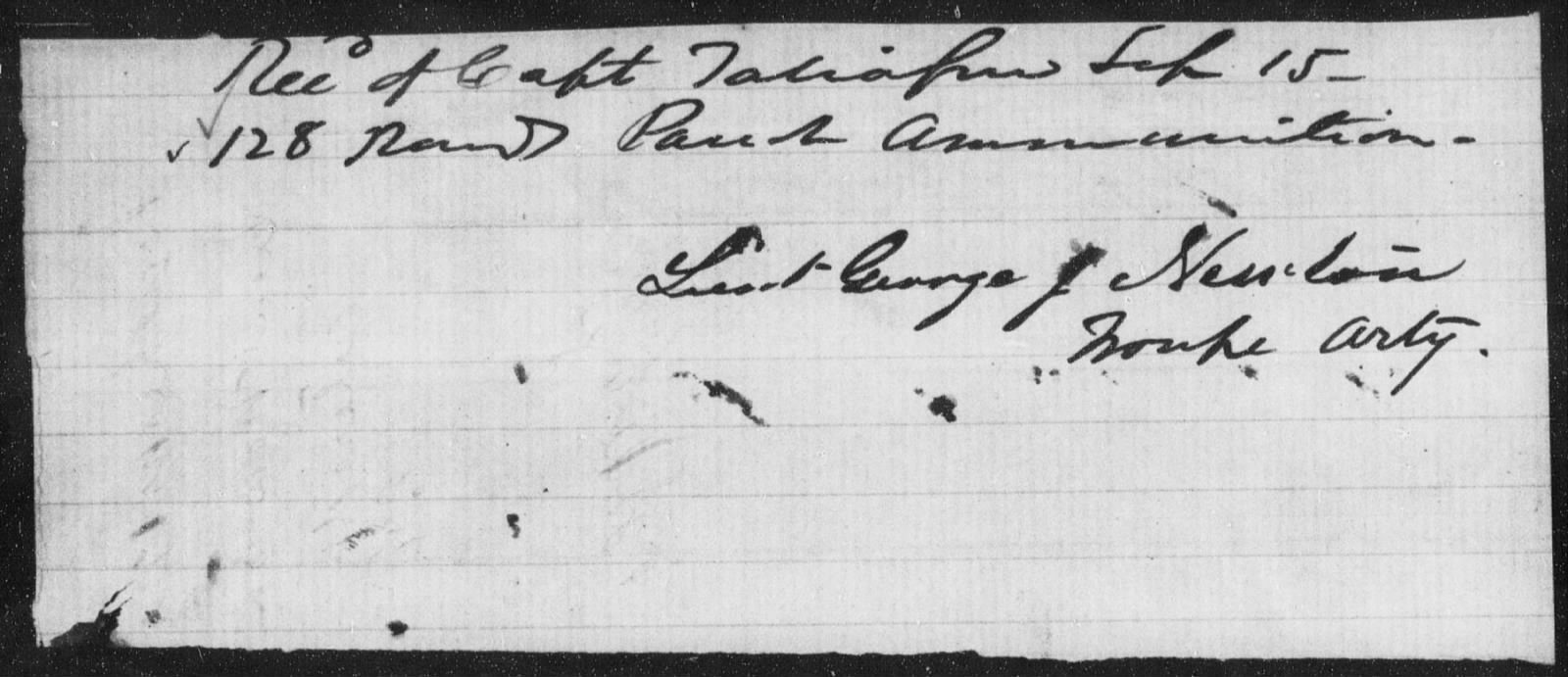 This was obviously hastily written – both men were certainly very busy that day. It took me a minute to decipher that scrawl enough to tell what type of rounds they were: I think it reads “128 Rounds Parrot Ammunition.” The Troup artillery was equipped with 2 smooth-bore guns and 2 10-pounder Parrot rifles on the Maryland Campaign of 1862.