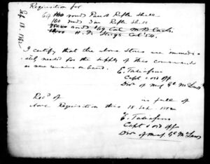 This paper is from Taliaferro’s CSR jacket, as are hundreds of similar documents and correspondence concerning issue of and accounting for ordnance stores during his service as an ordnance officer from 1862 into 1865.