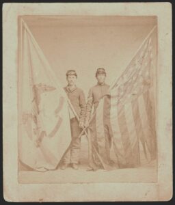 Here are Private Chester S. Rhoades (left) of Company H, 34th New York Infantry holding the state flag and Sergeant Charles B. Barton of Company C with the national colors. Both were in action at Antietam on 17 September 1862, at the head of their regiment at the front left of Major General John Sedgwick’s Division of the Union 2nd Army Corps as they crashed into the Confederates of Major General Lafayette McLaw’s Division in the West Woods that morning [map].