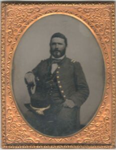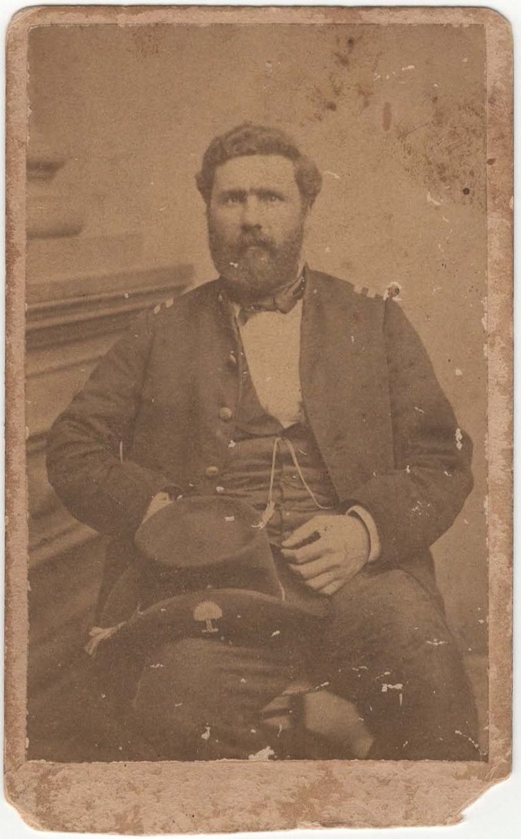 The shoulder bars on his coat are a bit unusual, but probably represent the rank of First Lieutenant, which he held from 25 April to 20 June 1862, before his appointment to Major.