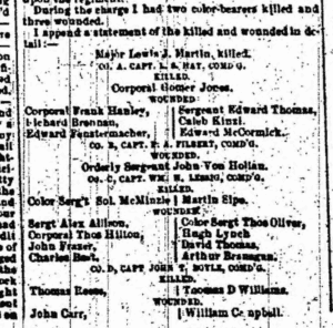 Appended to Colonel Cake’s official report as printed on page 2 of the Pottsville (PA) Miner’s Journal of Saturday, 4 October 1862, is his list of the men of his 96th Pennsylvania Infantry who were killed or wounded in the fight at Crampton’s Gap on South Mountain on 14 September 1862. It’s not found in the Official Records in company with the Colonel’s report.