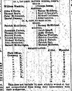 ¶ Barnett McMulligan not found in any roll or roster for the regiment. Possibly confused with Barney McMichael, who was KIA. Or possibly Bernard McMonigal/McGonigal: Irish born miner, enlisted in Pottsville in October 1861 at age 45, reenlisted, transferred to the 95th Pennsylvania, and mustered out in July 1865.